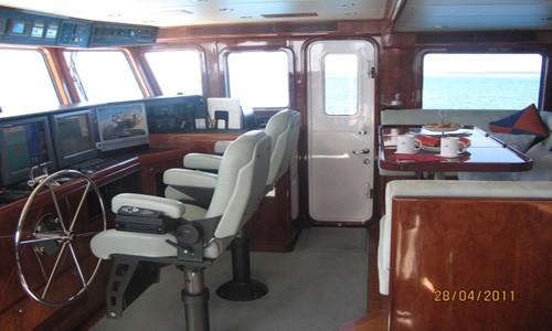 Upstairs the pilot house offers a breakfast nook and a rare Captains bird’s eye view.