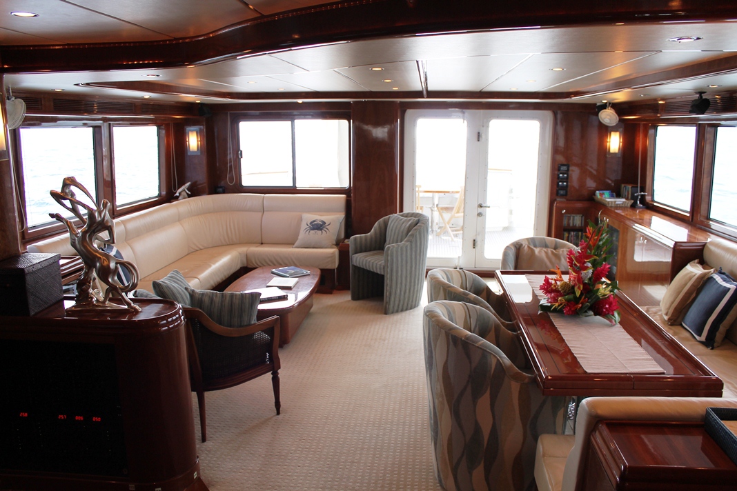 M/Y BEYOND CAPRICORN has a timeless traditional interior; the salon features a large leather settee and ...