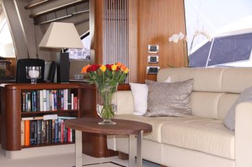 The formal dining space is forward and features a large table with tall back leather chairs, aft the salon offers ample seating on 2 settees either side plus additional lounge chairs.
