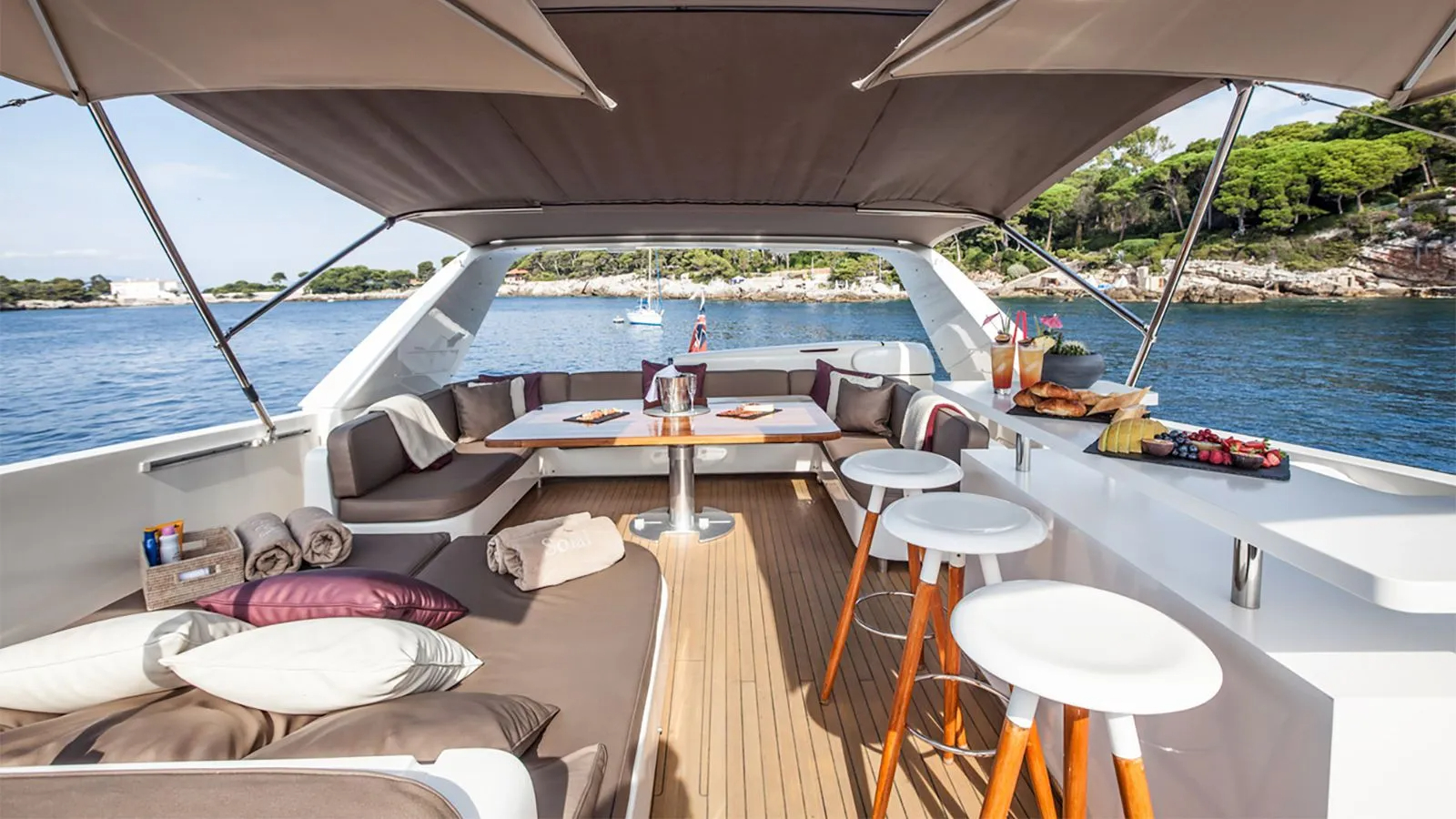 Charter yacht SOLAL offers plenty of external deck area, the aft deck is shaded and offers an alfresco dining option with relaxing cushioned wicker seating, the decks continue forward on both sides of the yacht.