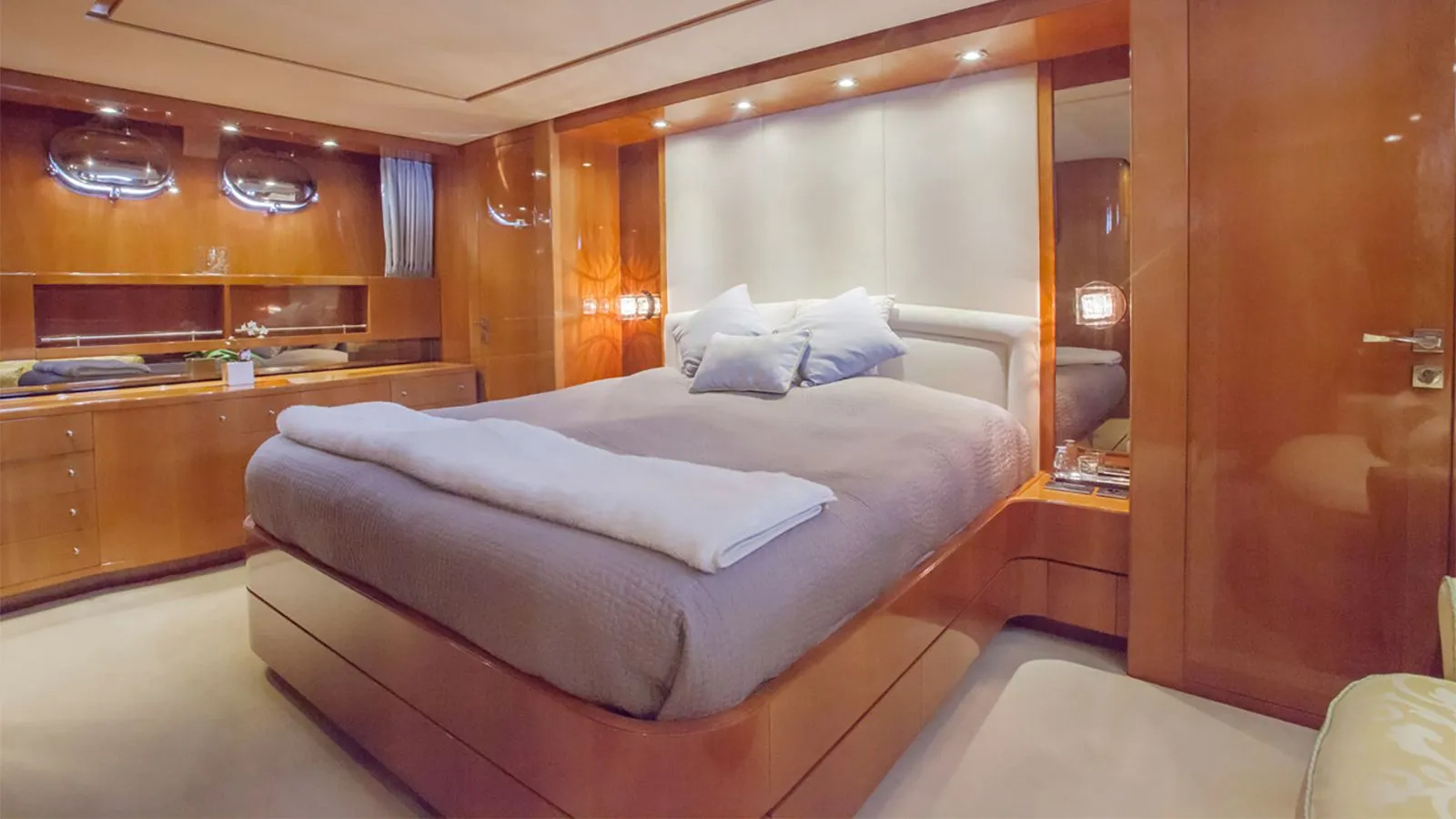 Above decks the fly bridge features an alfresco dining option, large sunpad and removable Bimini creating a multi-functional space.