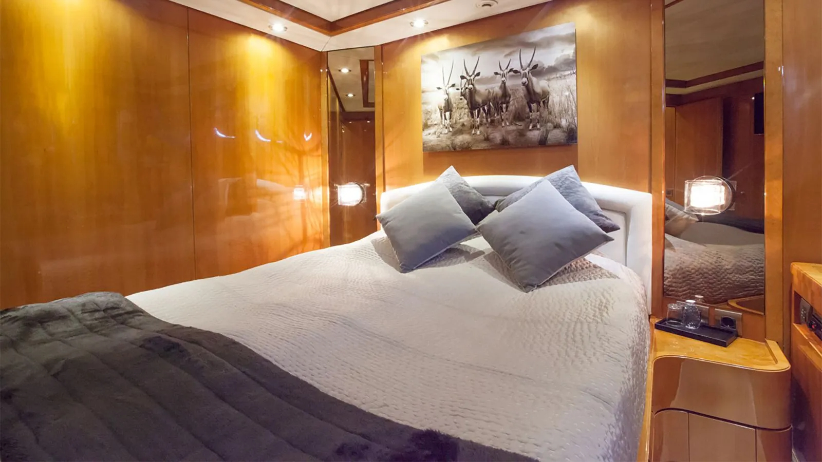 Above decks the fly bridge features an alfresco dining option, large sunpad and removable Bimini creating a multi-functional space.