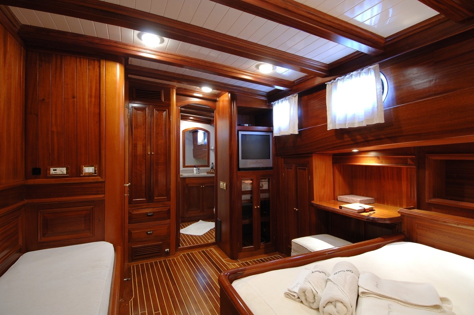 Her full-width double master cabin and two twin cabins are located aft. The master cabin has its own entertainment system with television, DVD player and CD player. There are two double cabins located forward of the saloon, one ...