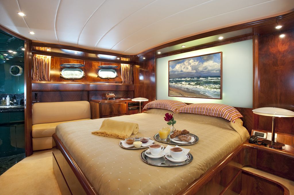 Luxury Motor Yacht CENTO is quite unique in providing three spacious double cabins. The large master cabin amidship offers a king sized double bed with a walk-in wardrobe and en-suite bathroom, fully outfitted with a Spa Pool bath. The master is equipped with TV, DVD, surround sound music system & minibar.