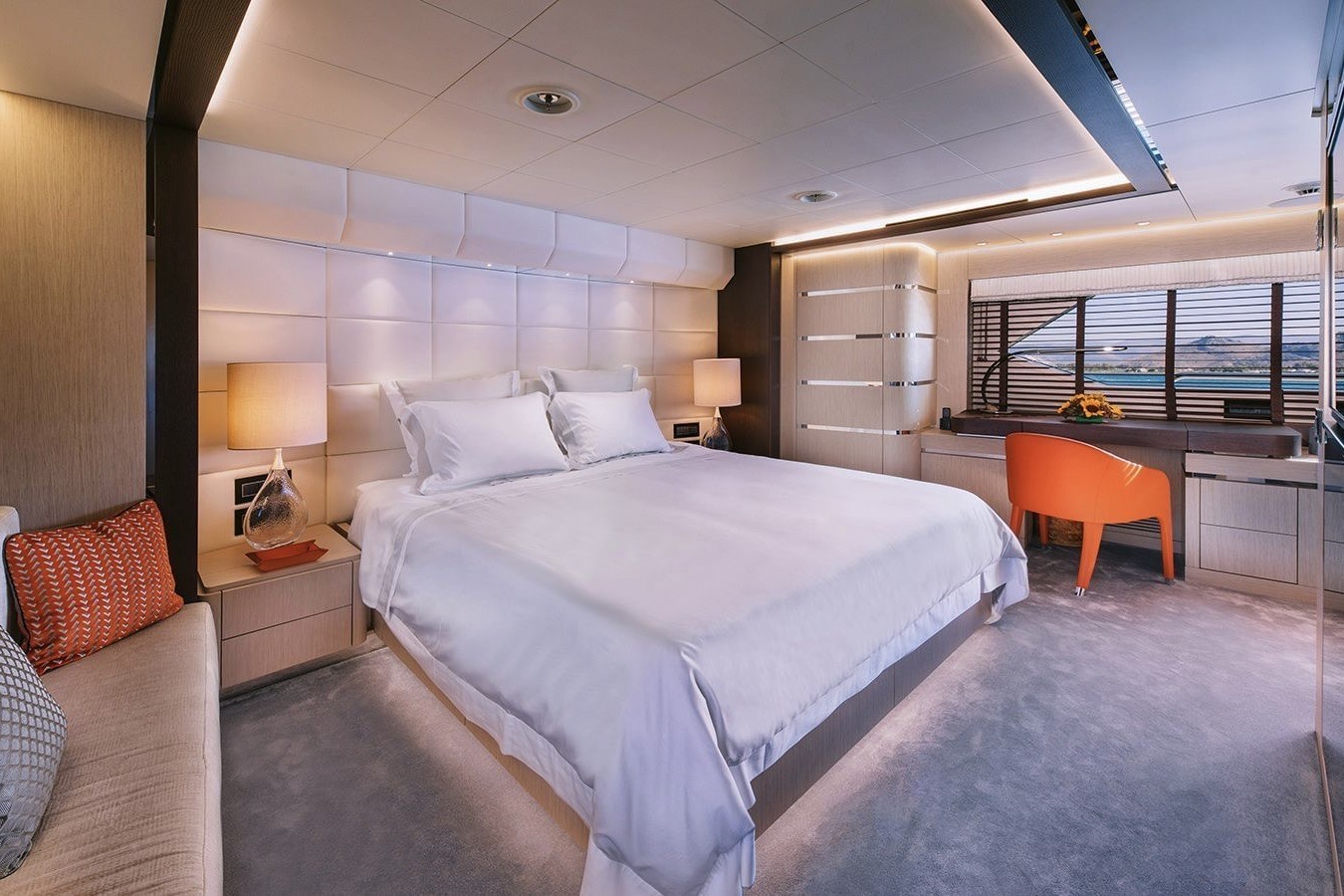 The Master cabin onboard XANA is located on the main deck and spans full width of the beam.The Master suite is located forward with separate office that can be used as part of Master suite or independently as a guest office.