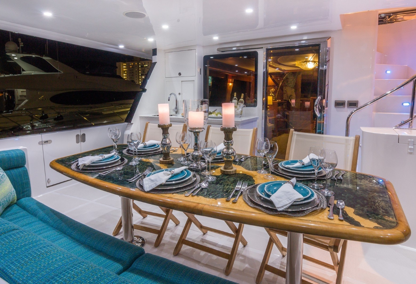 Some of her special features include a flexible layout to accommodate 3 couples or groups with children, an expansive skylounge which adds extra living space, and a reconfigured Flybridge with built-in dining.