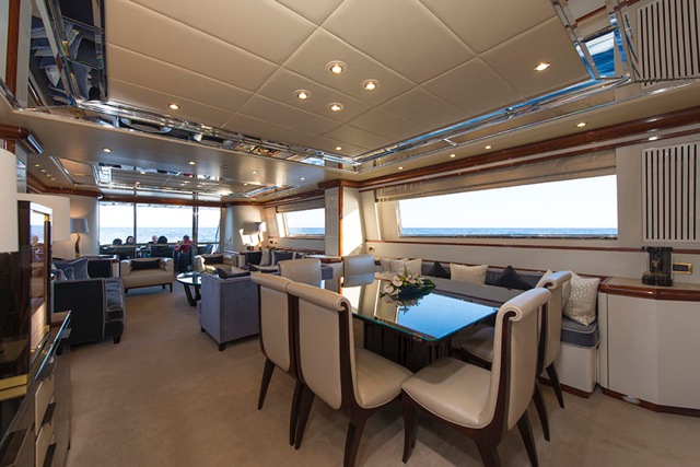 The main salon of the THE WELLESLEY II motor yacht is large and homely with 2 separate seating areas. The aft section of the salon features a large couch opposite a bar area. Further forward there is additional couch and seating, stairs leading to the accommodation area below and a large flat screen TV.