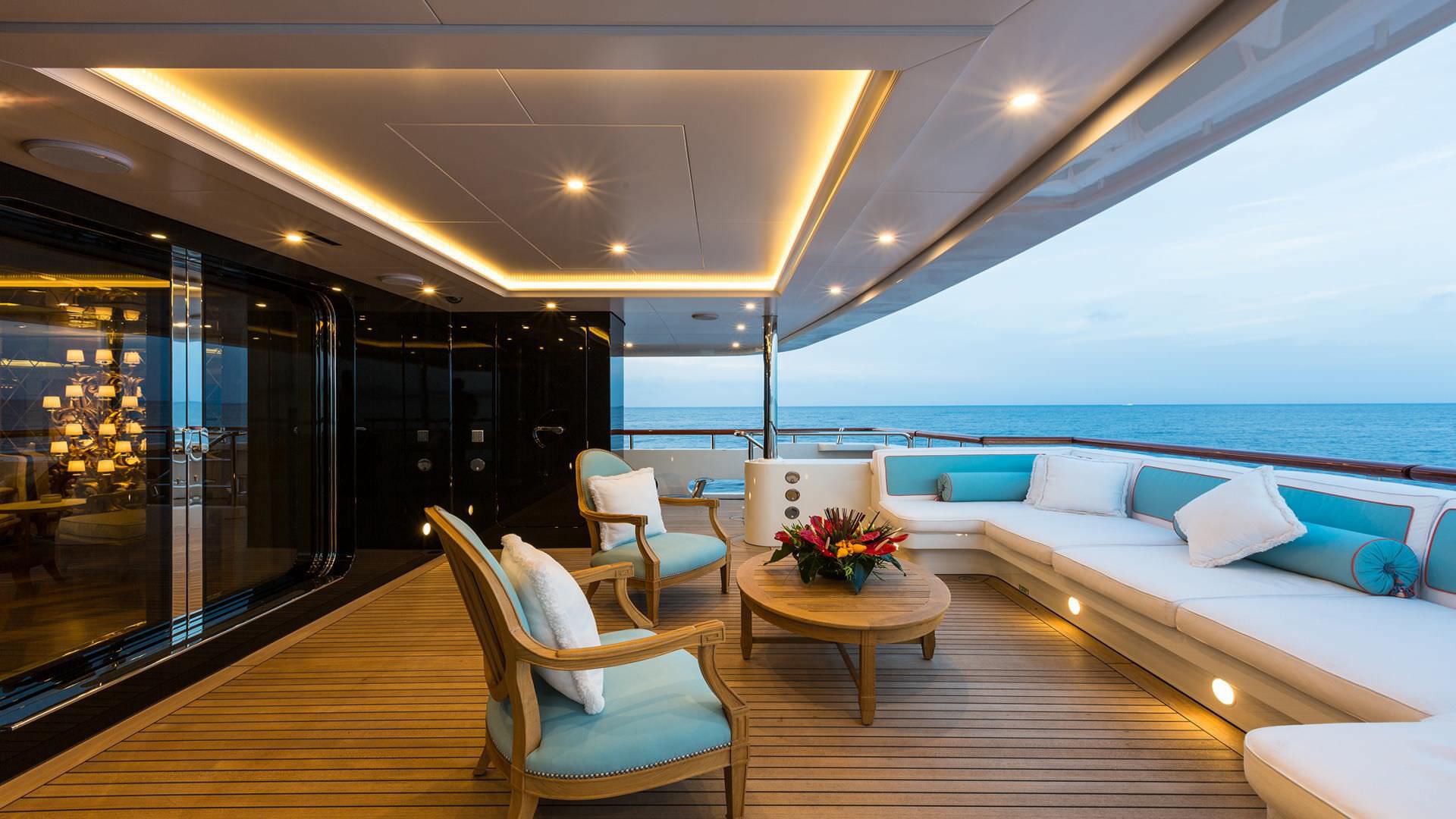 The sundeck has been designed to provide seating for large groups, there is a large dining table and a bar as well as a glass sided jacuzzi. Simply everything to make Lady Candy's guests entertained and relaxed.