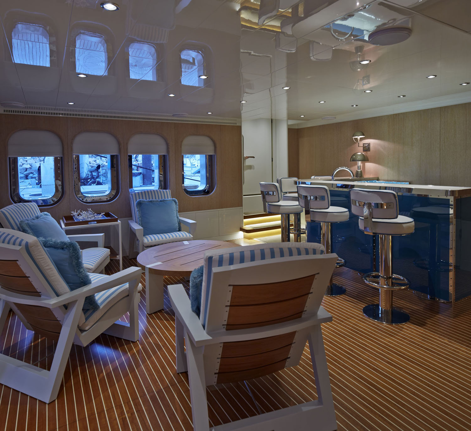 An entry area with a lounge bar and small table, a living area with sofas, armchairs and coffee tables, and a dining area. Briar root wood predominates and is combined with soft colours such as jade and lilac.