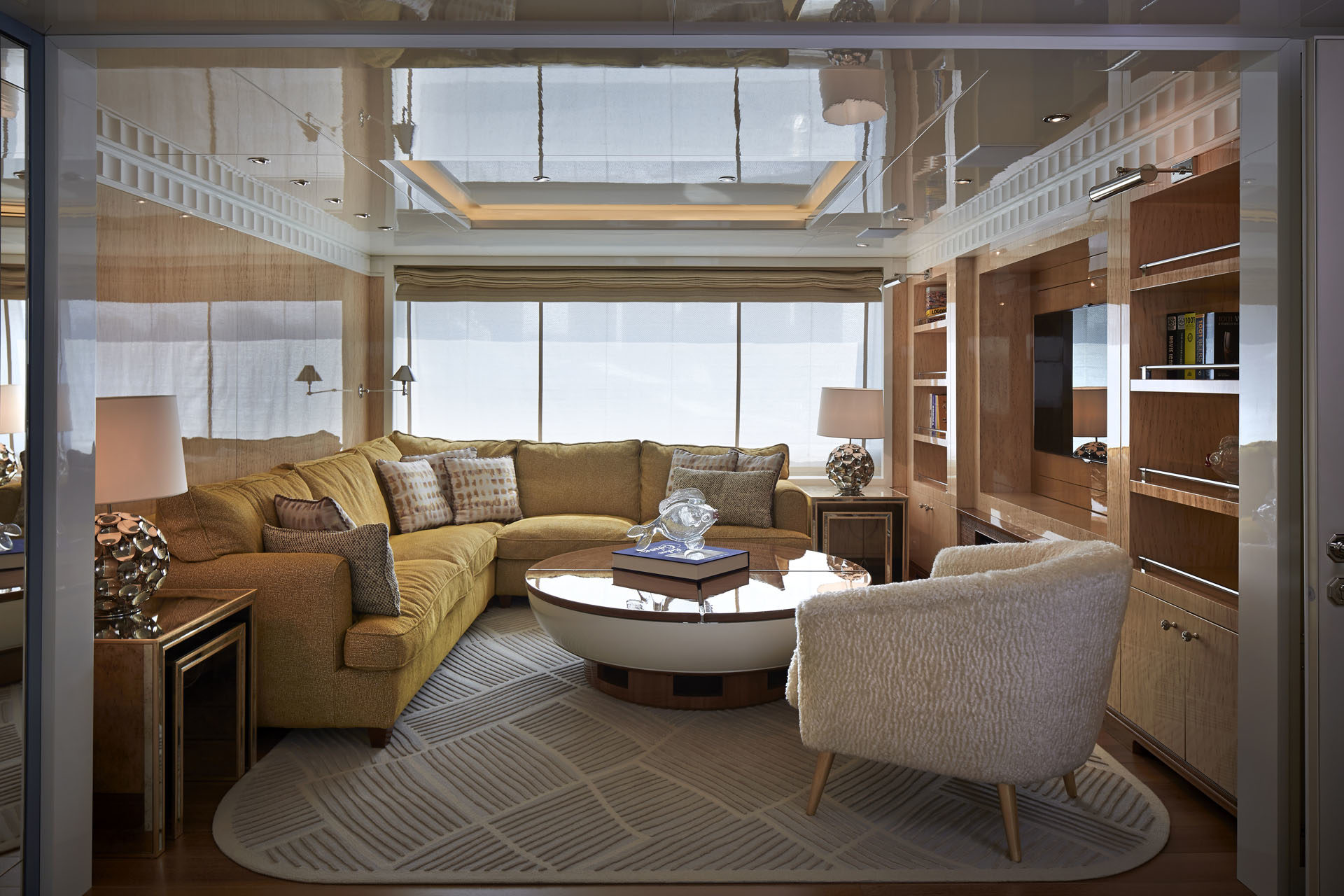 An entry area with a lounge bar and small table, a living area with sofas, armchairs and coffee tables, and a dining area. Briar root wood predominates and is combined with soft colours such as jade and lilac.