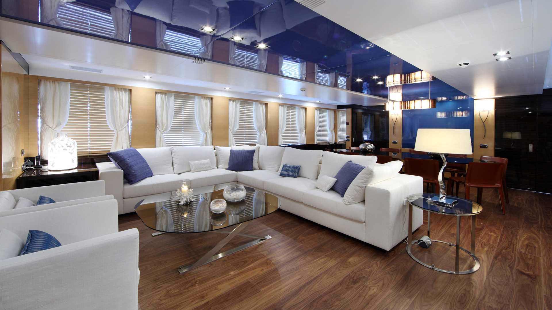 The salon is enormous, with 88m2 of welcoming and luxurious furnishings and is divided into three distinctive areas. An entry area with a lounge bar and small table, a living area with sofas, armchairs and coffee tables, and a dining area. Briar root wood predominates and is combined with soft colours such as jade and lilac.