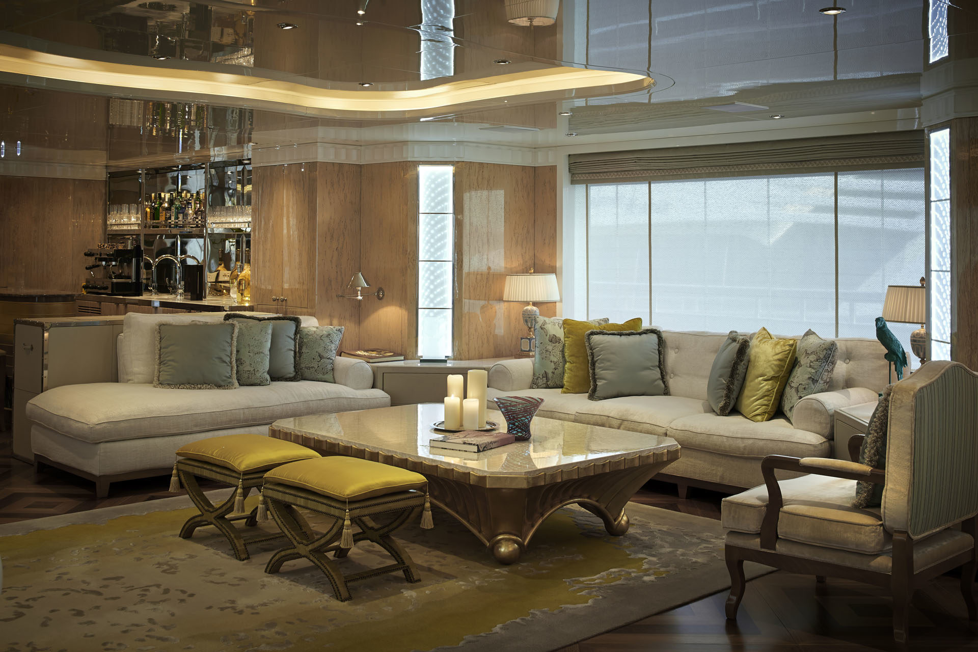 The salon is enormous, with 88m2 of welcoming and luxurious furnishings and is divided into three distinctive areas. An entry area with a lounge bar and small table, a living area with sofas, armchairs and coffee tables, and a dining area. Briar root wood predominates and is combined with soft colours such as jade and lilac.