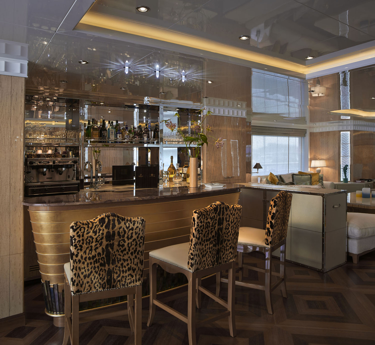 An entry area with a lounge bar and small table, a living area with sofas, armchairs and coffee tables, and a dining area. Briar root wood predominates and is combined with soft colours such as jade and lilac.