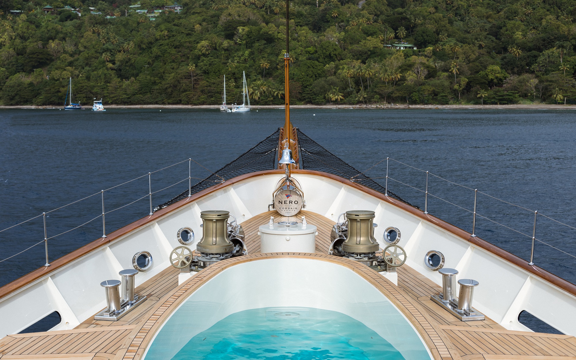 The upper deck bow has a large swimming pool with a ladder for ease of access in and out of the water.