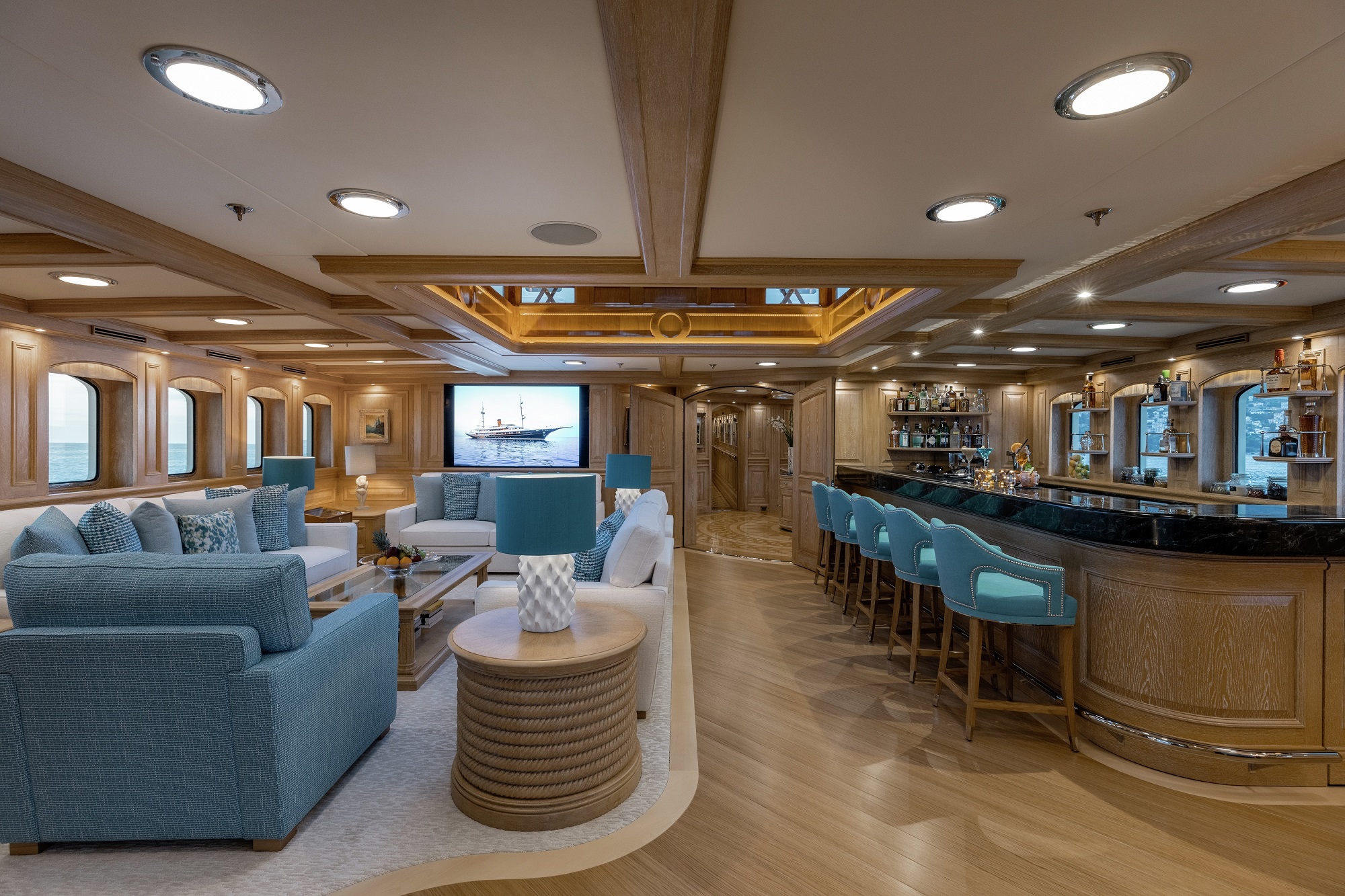 The port bar has an excellent selection of drinks which guests can sample while they catch up on the latest sports on the widescreen TV facing aft of the starboard sofas.