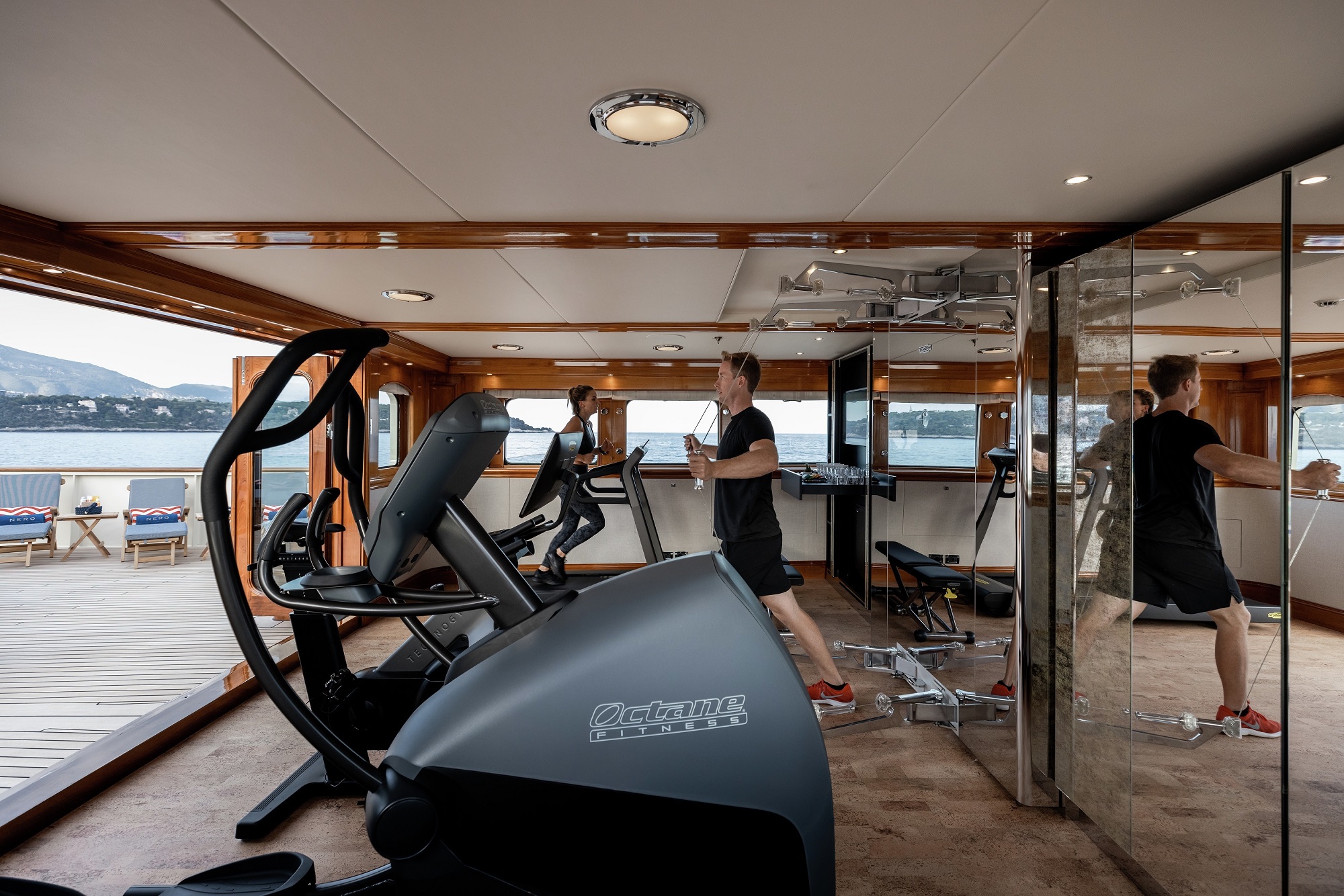 The main deck and the upper deck are connected by a stunning broad staircase, and the landing leads to a forward media room and the aft sky lounge with a forward gym.
