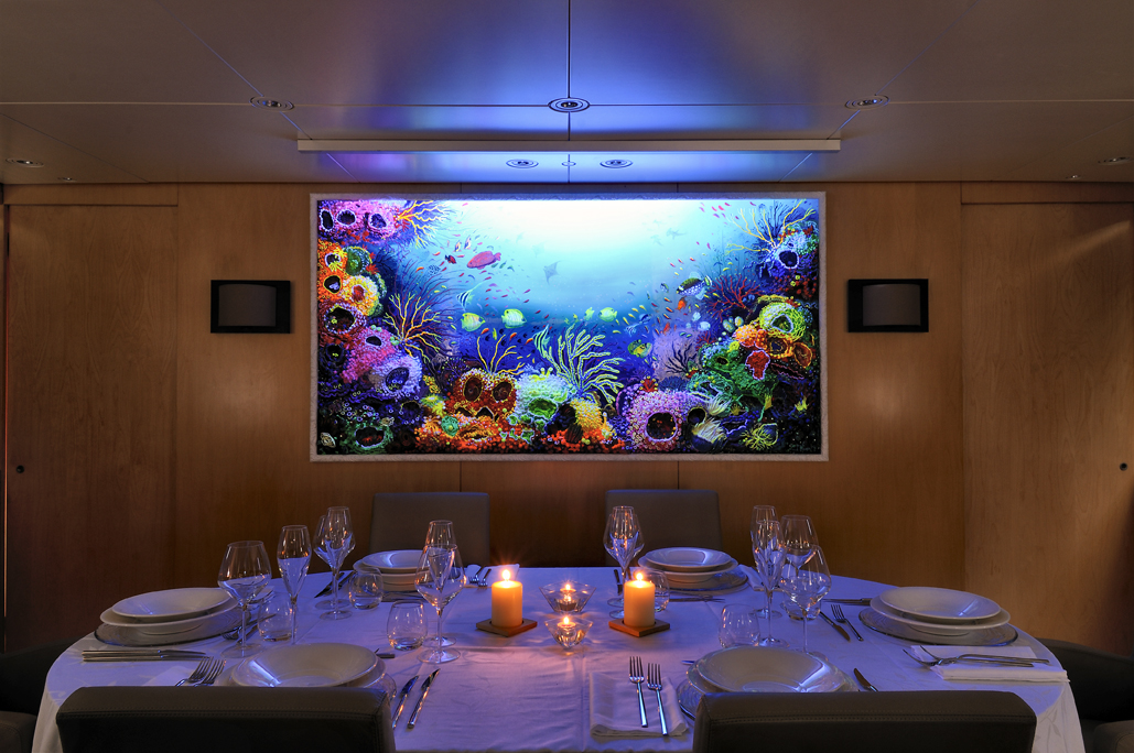 The dining is forward of the lounge space with a lovely dark oval table flanked by high back leather chairs. A flash of vibrant lit art on the bulkhead creates subtle mood lighting.