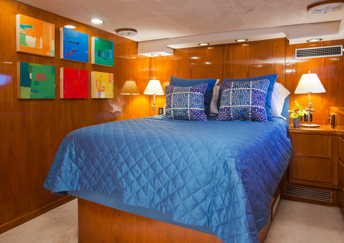 Charter yacht CAPRICORN has an elegant interior. The salon has a nautical meets country atmosphere, featuring deep blue ...