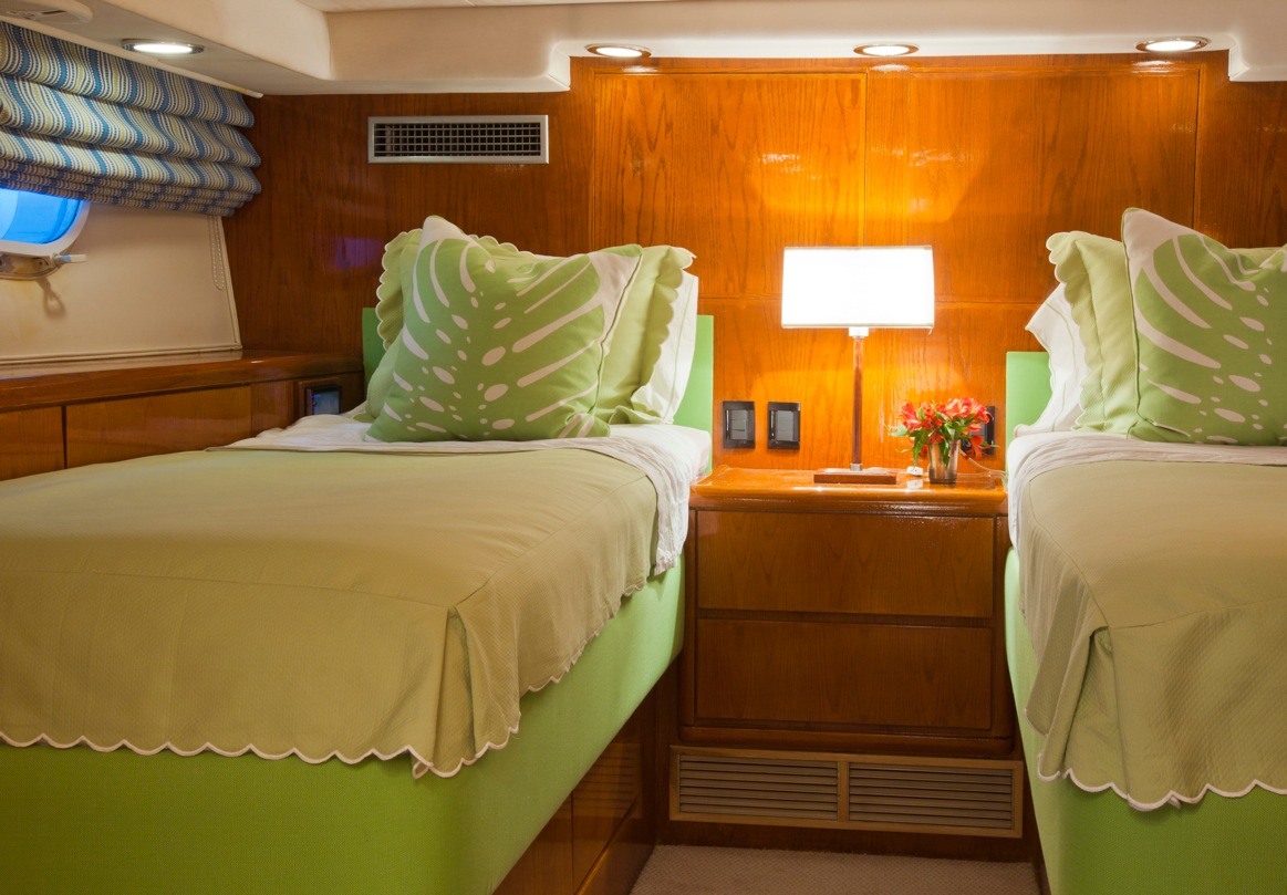 2 further guests cabins are on the lower deck with a queen size bed and 2 singles, both with en-suite facilities. A VIP cabin is on the main deck forward with a queen size bed and en-suite facilities. Each cabins features unique artwork and offers Sat TV, DVD, Wi-Fi and IPod hook docks.