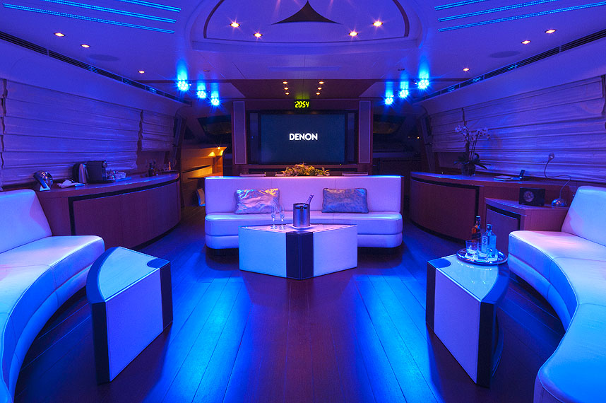 The salon is large and airy with ample crisp white leather seating, quality wood floors and light panelling. By night the salon offers a nightclub theme with colourful lighting and the latest in visual and audio systems.
