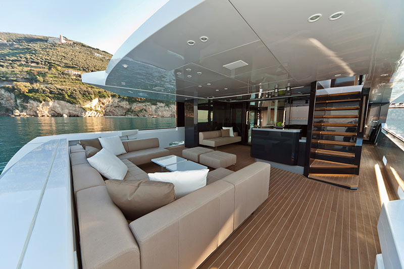 The luxury yacht SUN has a beam of 8.1 meters (26.7ft), with a draught of 2.3 meters (7.7ft) and reaches an incredible maximum speed of 16.5 knots thanks to her twin 1,224 HP MAN diesel engines.