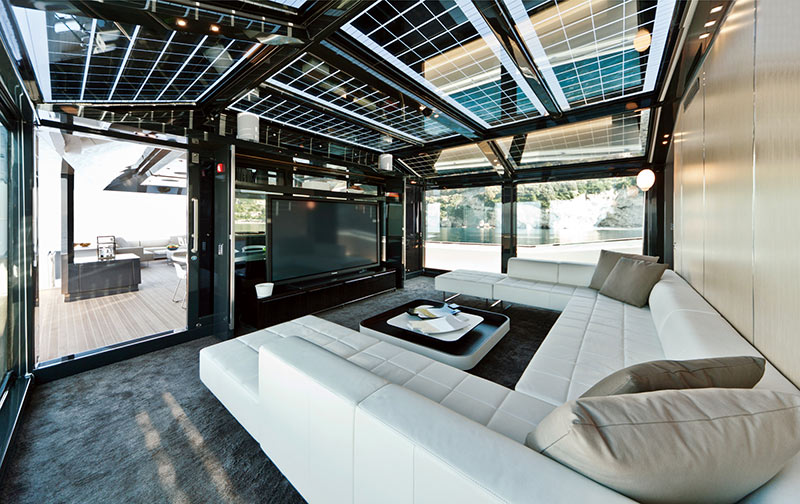 The stunning SUN superyacht features extremely innovative eco-friendly design by Francesco Guida, as for example her brilliant transparent look optimising natural light penetration in the interior portion, or the solar panels providing enough energy to limit the use of generators.
