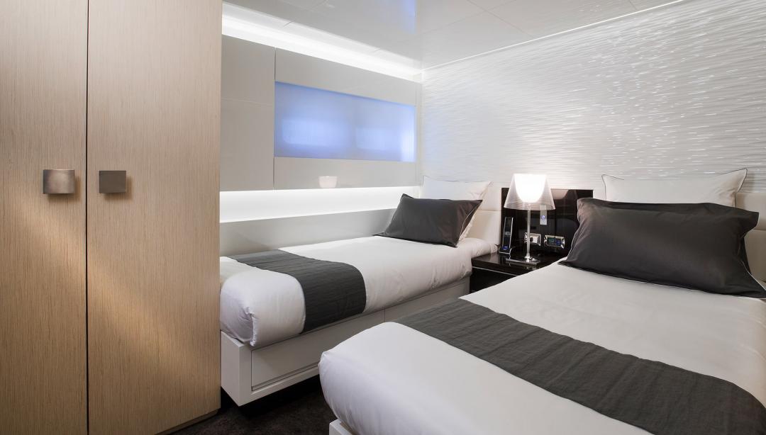 Arcadia 115 super yacht SUN accommodates 12 guests in her marvellous full-beam master suite on the main deck, and four double cabins on the lower deck, featuring some unusual characteristics, such as the foredeck dedicated to ...
