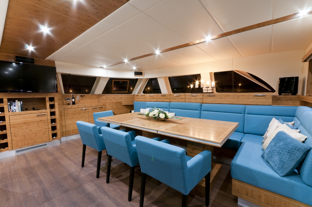 There is a beautiful saloon/dining room on the main deck with two coffee tables convertible into one large dining table, a 40´ LCD TV and DVD, and a fully equipped galley with an ...