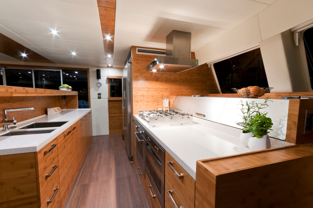 There is a beautiful saloon/dining room on the main deck with two coffee tables convertible into one large dining table, a 40´ LCD TV and DVD, and a fully equipped galley with an elegant and handy bar to serve drinks and ...