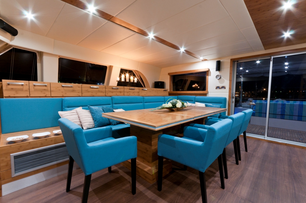 There is a beautiful saloon/dining room on the main deck with two coffee tables convertible into one large dining table, a 40´ LCD TV and DVD, and a fully equipped galley with an elegant and handy bar to serve drinks and ...