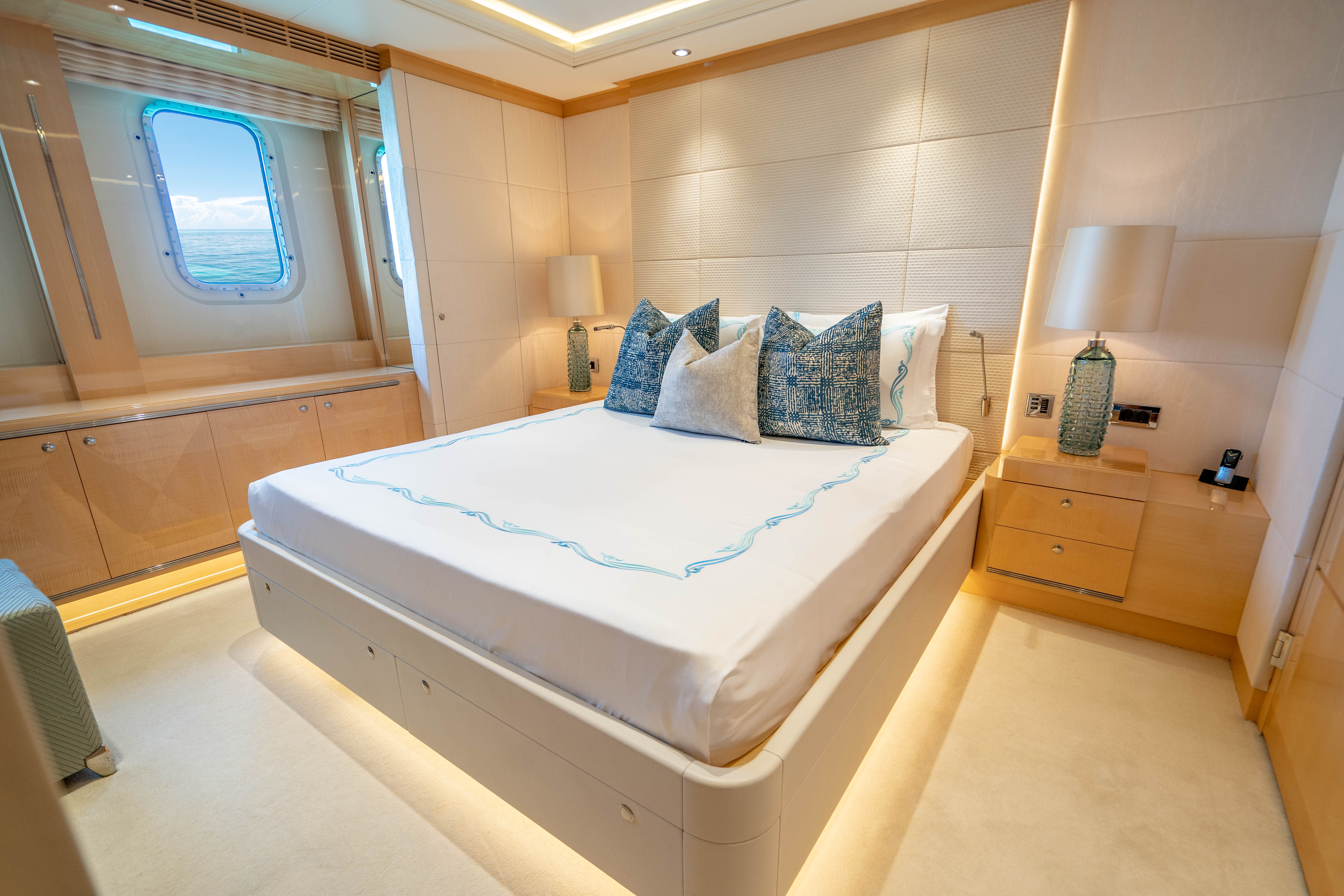 Past the foyer is the skylounge, where a wet bar is situated in the forward port corner to serve guests lounging on the sofas and armchairs beneath the starboard windows, or at the dining table for six forward to starboard for ...