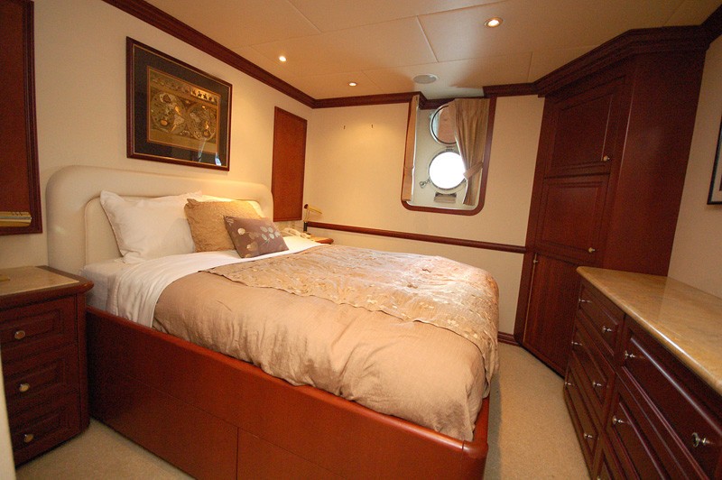 The cabin configuration consists of a Master cabin with a king size bed, bath tub, shower and toilet. There are 4 Guest cabins with a queen size bed, shower and toilet. There is one Guest suite with a queen size bed, 2 single beds, a bath tub, shower and 2 toilets and a Guest cabin with a twin bed, shower and toilet.