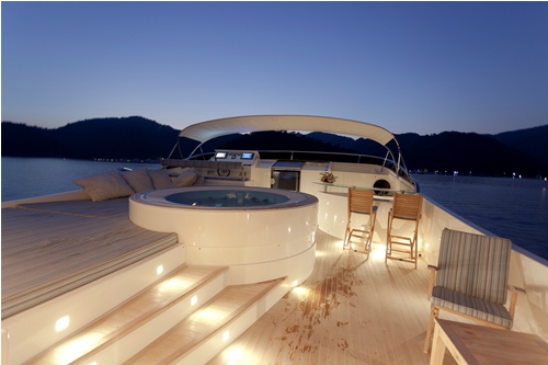 Her flybridge is well designed with plenty of space for dining and relaxation. In addition to her dining area she has a bar and service area plus a large Spa Pool surrounded by sunpads plus 4 sunlounges. There are further sunpads on the fordeck for up to 4 guests.