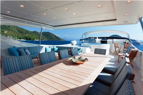 Her flybridge is well designed with plenty of space for dining and relaxation. In addition to her dining area she has a bar and service area plus a large Spa Pool surrounded by sunpads plus 4 sunlounges. There are further sunpads on the fordeck for up to 4 guests.