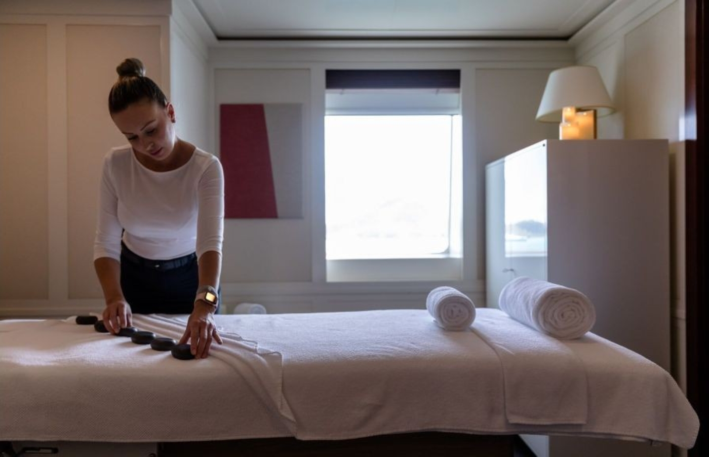 The beach club forms a comfortable and convivial setting for films on the widescreen TV and resting out of the sunshine, with the glass-bottomed swimming pool on the main deck aft providing a large skylight.
