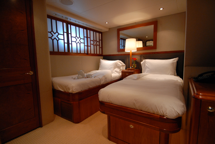 Motor yacht DONA LOLA is able to accommodate up to 10 guests in 5 cabins including a master suite on main deck forward, two double cabins and two twin cabins on lower deck, all with ensuite facilities.