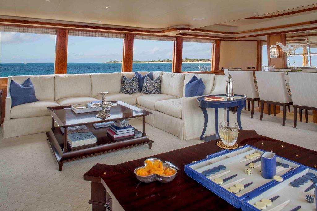 The salon features a plush 3 piece cream suite with wood trim marble coffee table, cocktail/games table and visual and audio entertainment. Forward of the salon lounge, the formal dining table is in an open plan.