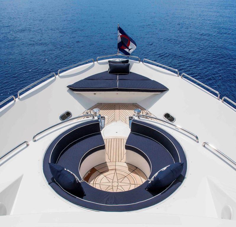 Wrap around decks lead to the M/Y SHARON LEE's spacious foredeck, complete with sunpads and circular built in seating.