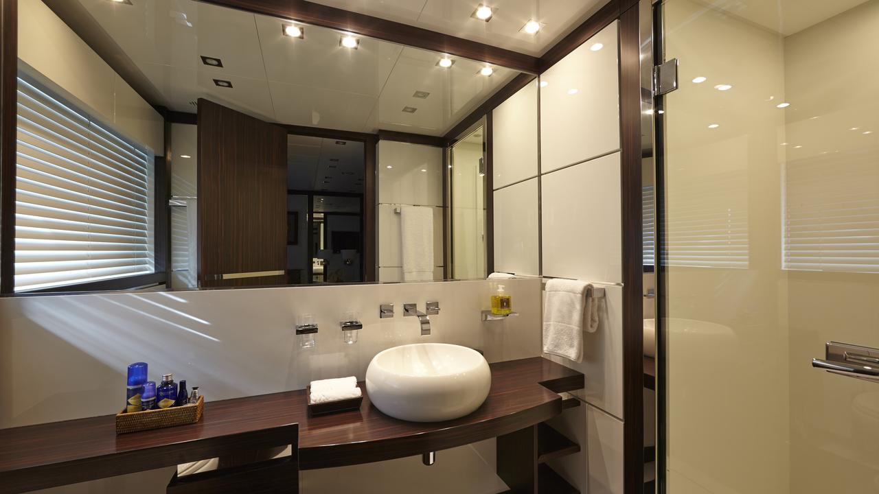 On her main deck aft are further comfortable sunpads, a large dining table and steps leading down to the swim platform. Forward on the main deck is the spacious foredeck with more sunpads, a shade umbrella protecting a dining table.