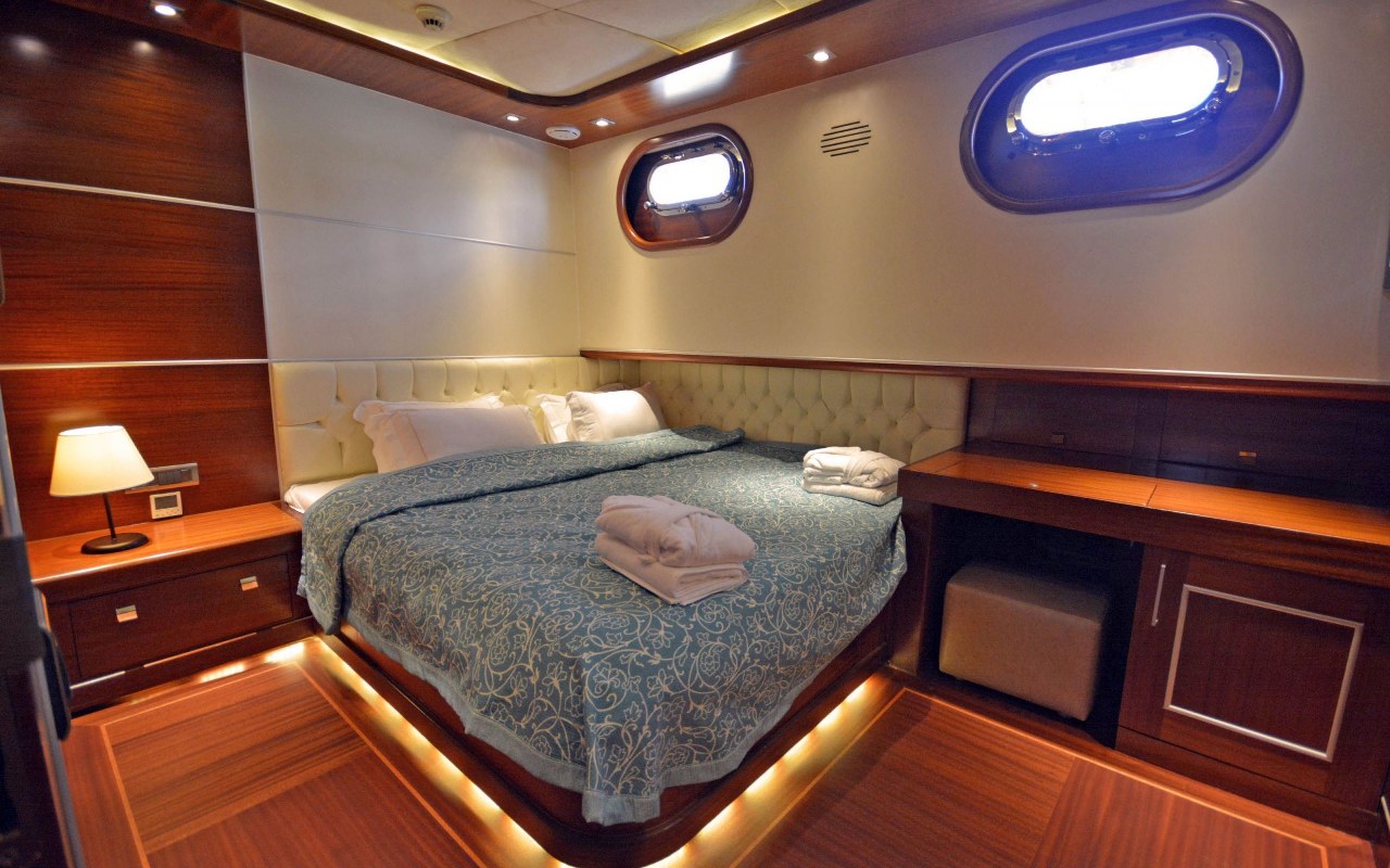 The yacht sleeps 12 charter guests in 6 stunning and highly-comfortable cabins, including a master suite, a VIP cabin, and two double and two twin cabins. Her aft master cabin is particularly spacious, located below decks to the aft spanning the full width of the beam.