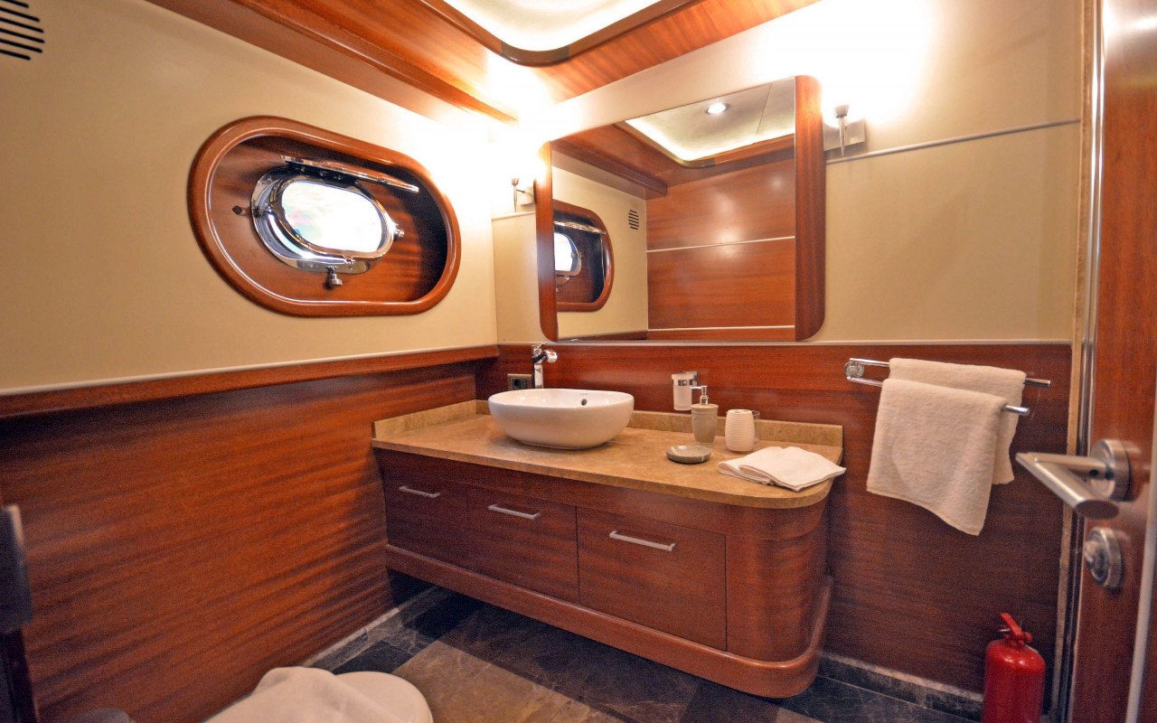 The yacht sleeps 12 charter guests in 6 stunning and highly-comfortable cabins, including a master suite, a VIP cabin, and two double and two twin cabins. Her aft master cabin is particularly spacious, located below decks to the aft spanning the full width of the beam.