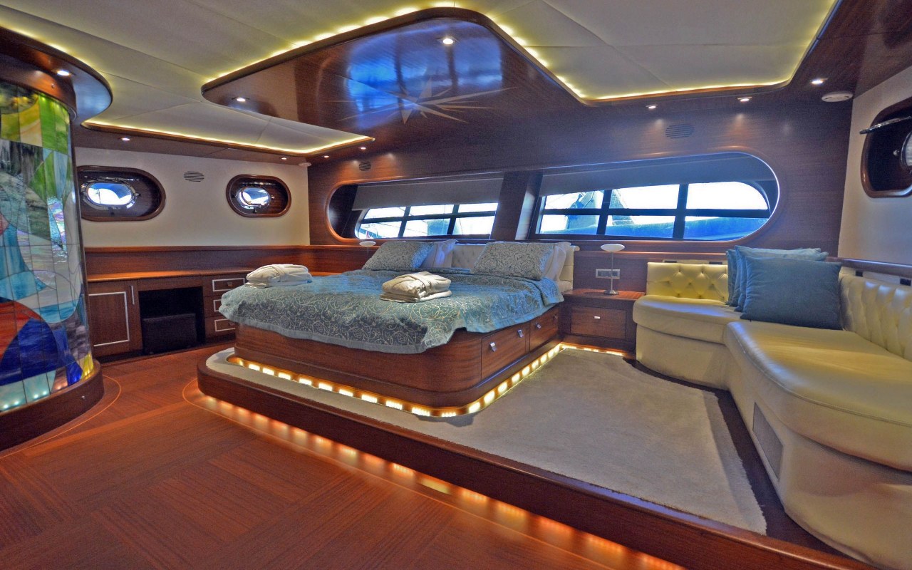 The yacht sleeps 12 charter guests in 6 stunning and highly-comfortable cabins, including a master suite, a VIP cabin, and two double and two twin cabins. Her aft master cabin is particularly spacious, located below decks to the aft spanning the full width of the beam.
