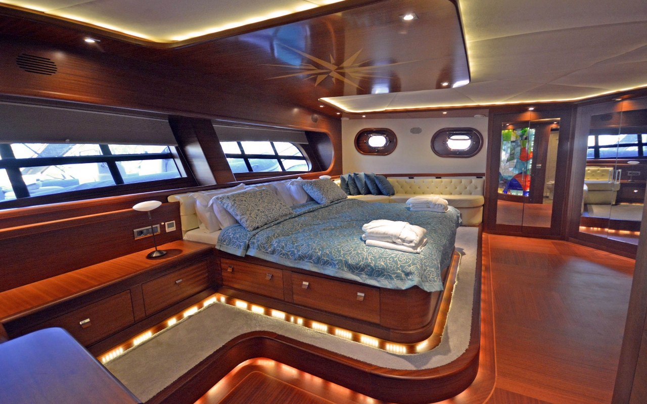The yacht sleeps 12 charter guests in 6 stunning and highly-comfortable cabins, including a master suite, a VIP cabin, and two double and two twin cabins. Her aft master cabin is particularly spacious, located below decks to the aft spanning the full width of the beam.