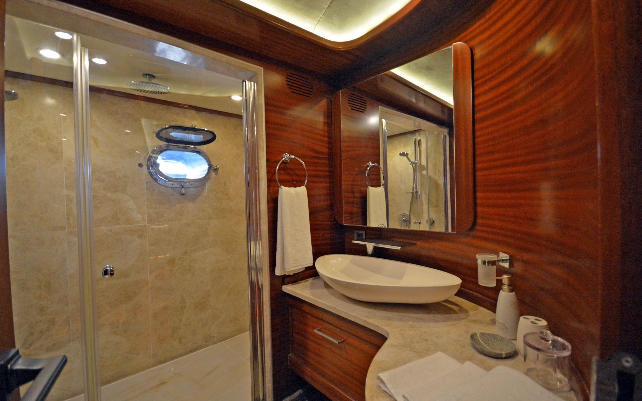 The yacht sleeps 12 charter guests in 6 stunning and highly-comfortable cabins, including a master suite, a VIP cabin, and two double and two twin cabins. Her aft master cabin is particularly spacious, located below decks to the aft spanning the full width of the beam.