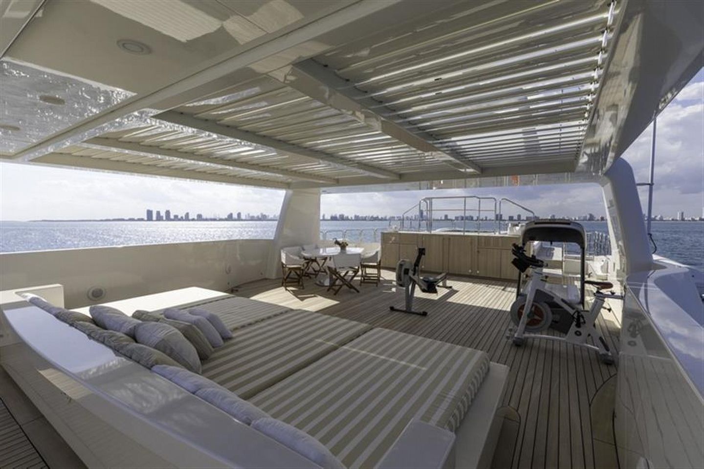 The sun deck aboard is generous and offers outdoor lounge space, full beam aft sunpad, forward sunpads, retractable partial shade and a large Spa Pool tub.