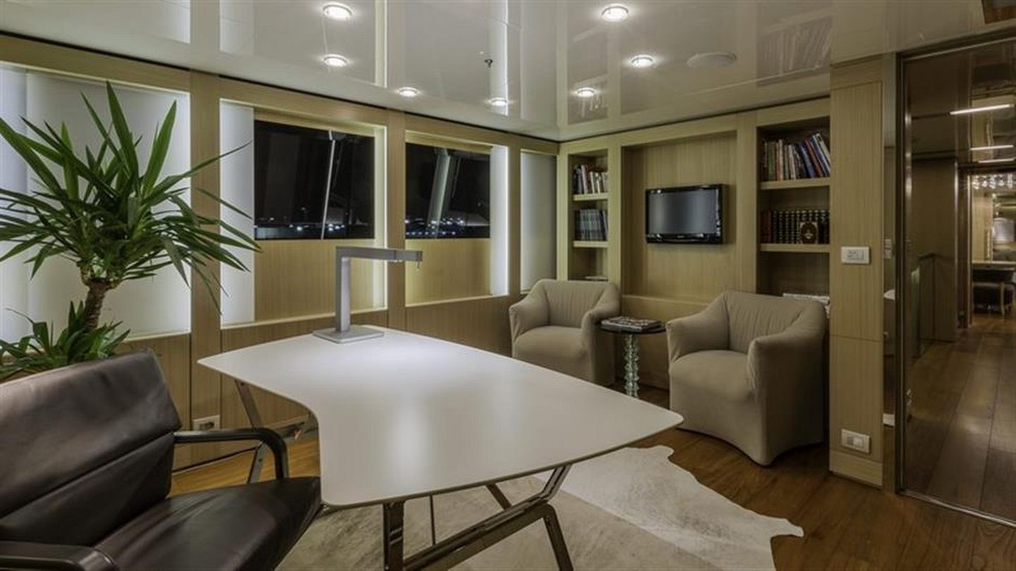 Aft of the upper salon, the exterior deck offers an alfresco dining option ideal for both formal and casual occasions. The interior design is by Sawaya & Maroni of Milan.