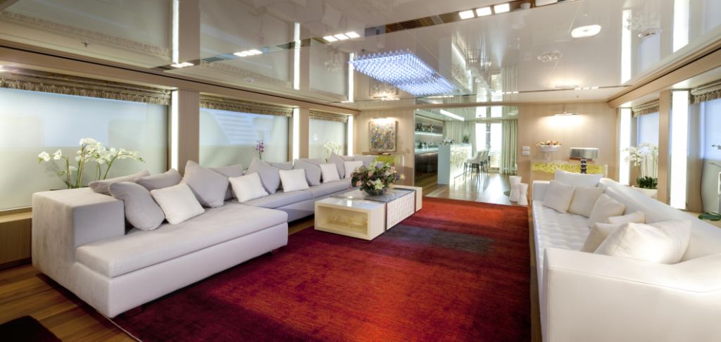 The main salon leads onto the casual shaded aft deck, with custom seating and cocktail tables, perfect to enjoy an evening aperitif from the adjacent wet bar. Above, the upper deck boasts an alfresco dining option aft of the lounge, great for both casual and formal events.
