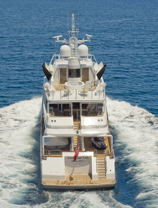 There is a popular Spa Pool aft, with etched glass bottom as well as two chaise lounges aft and a gym, fitted with resistance training machine, cardio machine (TBD), free weights, exercise balls, bands, Ipod dock and refrigerator/ice machine. Built-in sunpads with access via bridge are situated port and starboard.