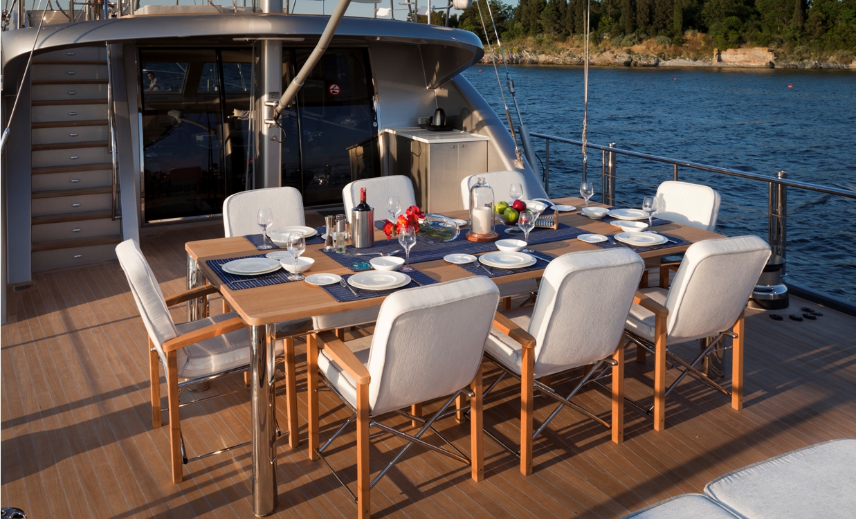 On the main deck the salon is inviting with beautiful multi grained wood floors, a massive sofa, large coffee table and additional ottoman, expansive wrap around windows offer plenty of natural light. The saloon gives a high aspect view with good 360 degree vision.