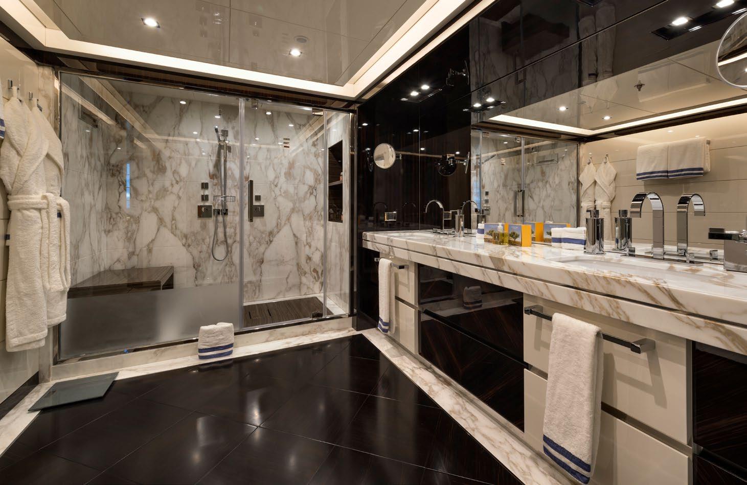 The master’s ensuite features a Turkish bath and a Spa shower. The yachts VIP stateroom is also located on the Main deck and has a queen size bed, a Dresser, a TV and a spa shower in the ensuite. There are also 2 double and 2 twin staterooms with a Pullman in one of the twins. Both of the cabins have en-suite bathroom with Spa showers.